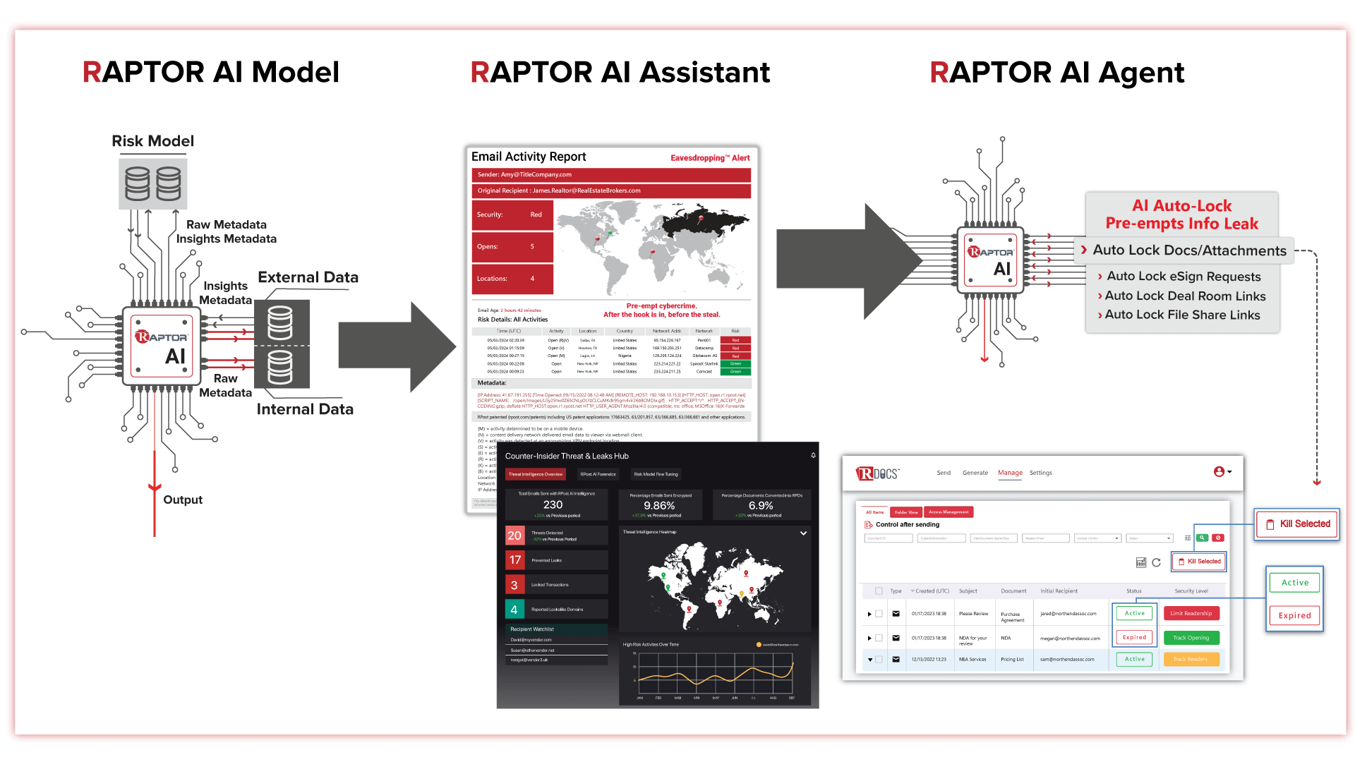 RAPTOR™ is RPost’s AI that uniquely can see otherwise unseen cybercriminal interaction with one’s sensitive content even beyond endpoints, curate Internet forensic threat data related to this anomalous activity, attribute the threat to a threat actor, then agentically and pre-emptively auto-lock this leaked content before seen, evidencing this killed content beyond endpoints, mitigating need to report a breach and mitigating cybercrime build-up.